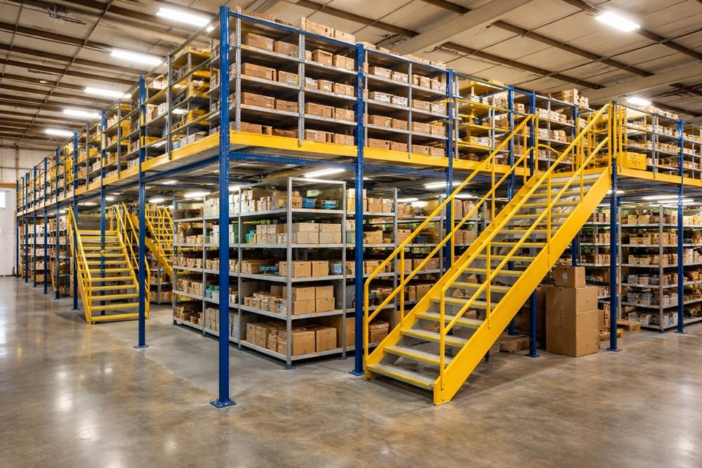 Mezzanine floors create additional usable space within your warehouse without expanding your building footprint. This solution increases storage capacity and improves workflow efficiency.